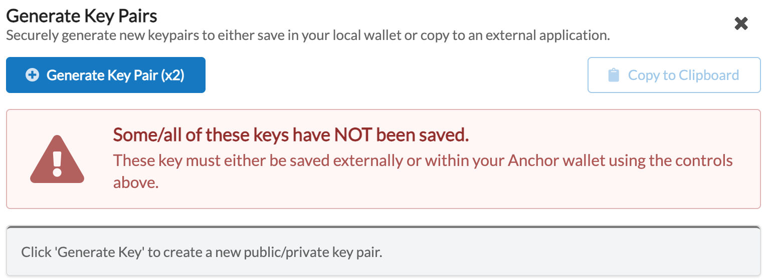 Step 1 Create New Keys To generate keys, you will need to go to “Tools” -> “Manage Keys” -> “Generate Key Pairs”. Click the “Generate Key Pair (x2) button and you will have created two new sets of keys for you to use. | ![]() |