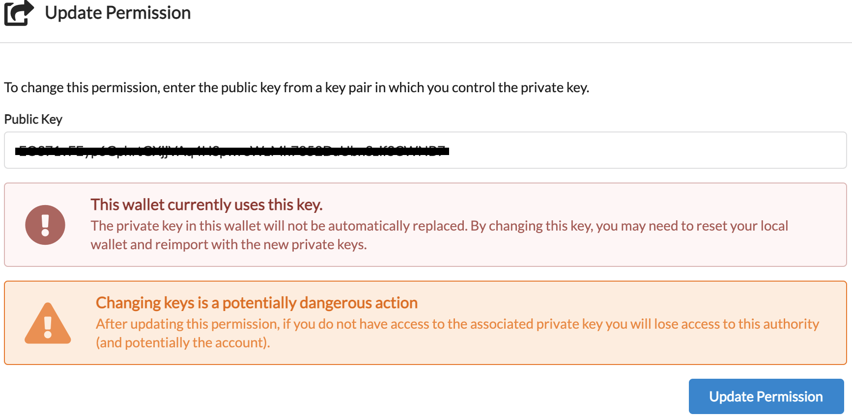 Step 2 Change Account Keys Now that we have created a new set of keys, we will want to change out the existing keys for our new set. To do this, we will need to go to “Tools” -> “Permissions” -> “Modify” under the “active permissions” section. Next, you will paste in the new PUBLIC key into the “active permissions” field and select “Update Permission” | ![]() |