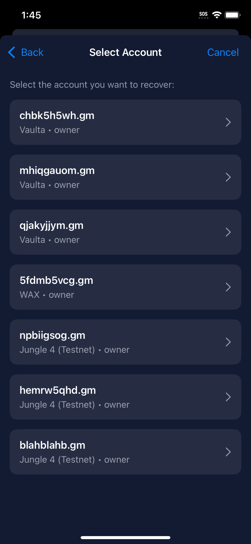 | Step3 Select Account to Recover After entering the pass phrase, you'll see all of the accounts that you have backed up using this phrase. Select the account you would like to recover to continue. | ![]() |