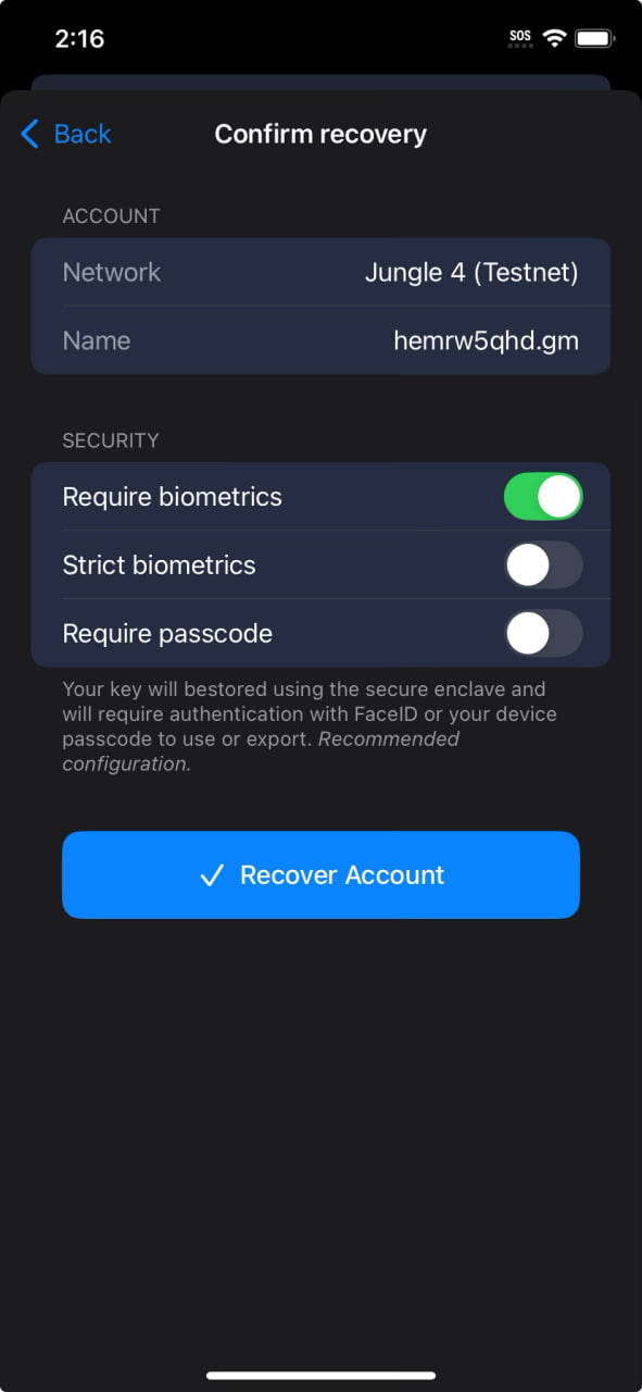 | Step 5 Confirm Recovery On this last step, make sure everything appears to be in order and pick whether you plan to use the biometric or PIN method to sign transactions. If all looks good, press “Recover account” | ![]() |